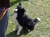 Posudek: 18 měsíců, černobílá, harmonicky stavěná, samičí výraz, silný pigment, velmi hezká hlava, tmavé oko, nůžkový zkus, správné úhlení, velmi hezká linie zad, výborná délka zad, střední síla kostí, velmi hezký pohyb, velmi milá povaha, hezké předvedení.