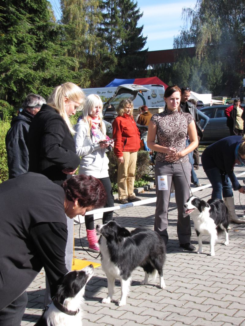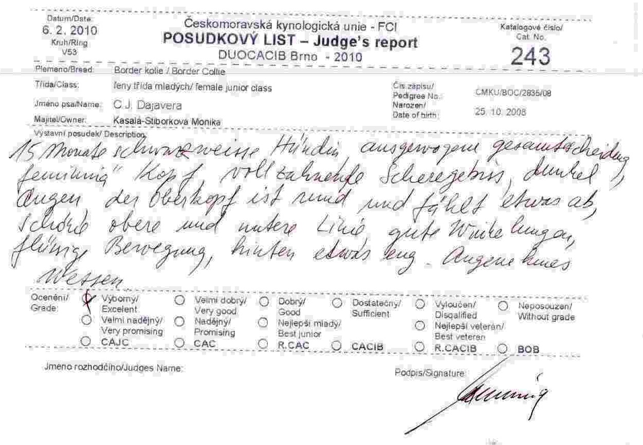 Posudek: 22měs. fenka, pěkná v typu, výb. hlava, krásné ucho, oko by mohlo být méně kulaté, nůžk. skus, lehce zaškrcená za kohoutkem, vzadu užší chod, výborný pohyb, srst výb. kvality i barvy.